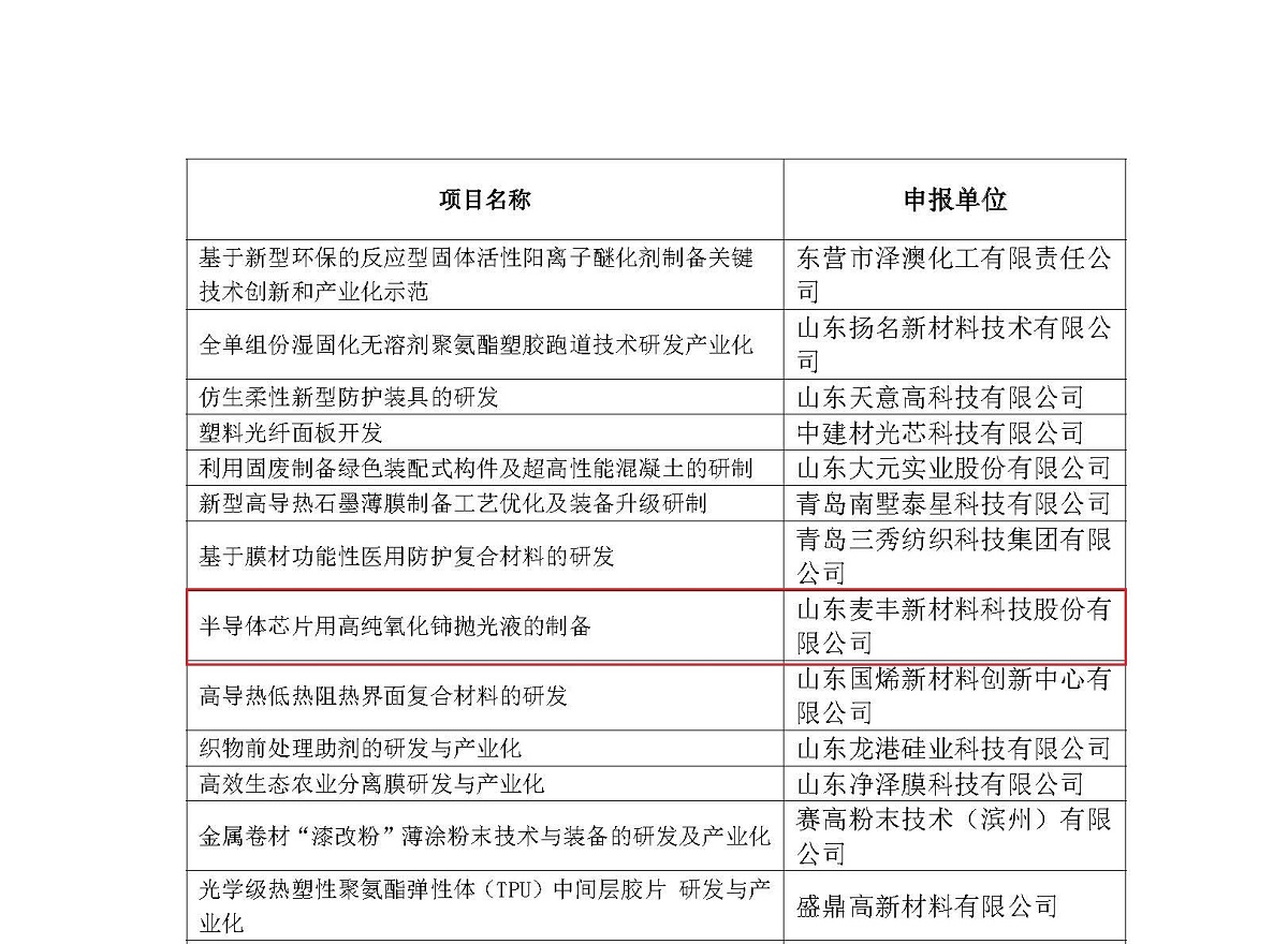近日,山東省科學(xué)技術(shù)廳發(fā)布了《關(guān)于2021年山東省科技型中小企業(yè)創(chuàng)新能力提升工程擬立項項目公示的通知》,其中我司”半導(dǎo)體芯片用高純氧化鈰拋光液的制備“項目上榜!
