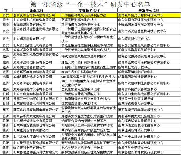 近日,《山東省中小企業(yè)局文件(魯中小企局字[2015]64號)》公布了省級第十批 “一企一技術”研發(fā)中心和第八批“一企一技術”創(chuàng)新企業(yè)名單,泰安麥豐新材料科技有限公司通過市局推薦、省局初審和專家委員會嚴格評審,成功獲評省級“一企一技術”研發(fā)中心。
